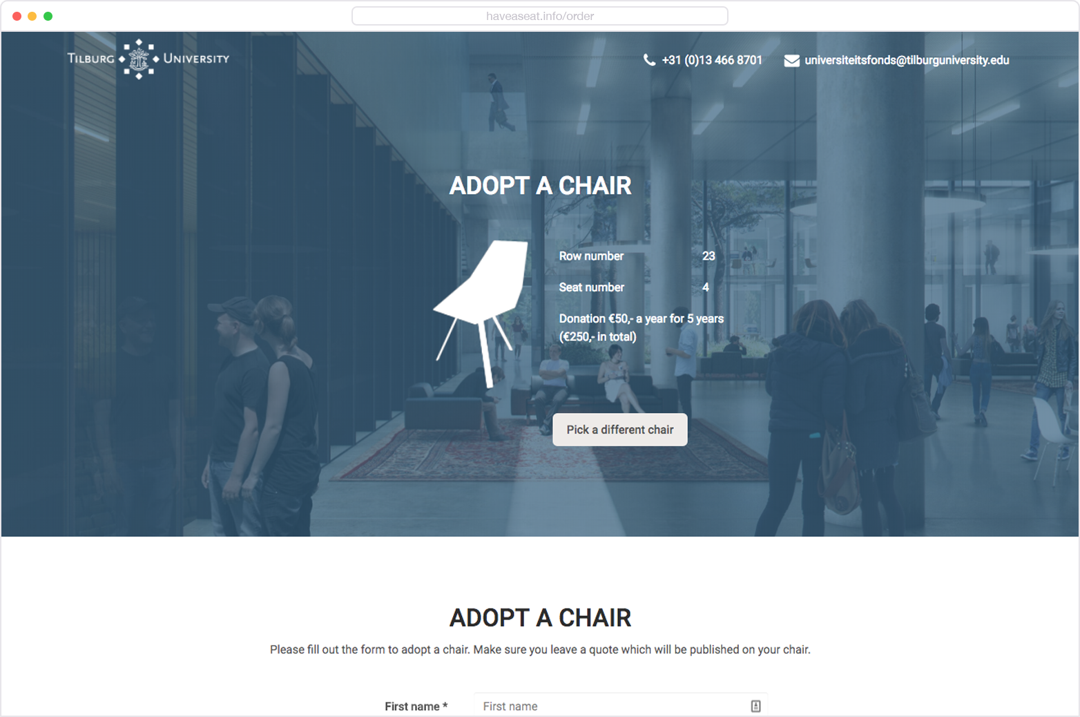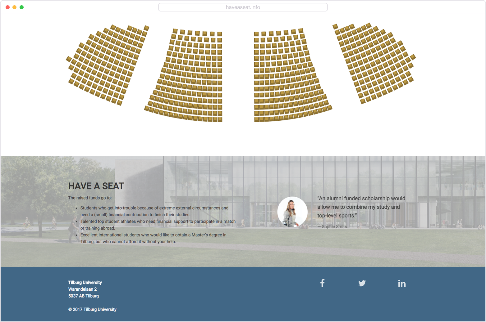 Tilburg University wilde een online platform waarop studenten, afgestudeerden en oud-professoren met elkaar in contact gebracht worden. De vraag was om dit te doen via een website waarop de afgestudeerden en oud-professoren stoelen in de nieuwe collegezaal sponsoren. Het geld dat dit oplevert wordt vervolgens gebruikt om speciale projecten van studenten te kunnen financieren.